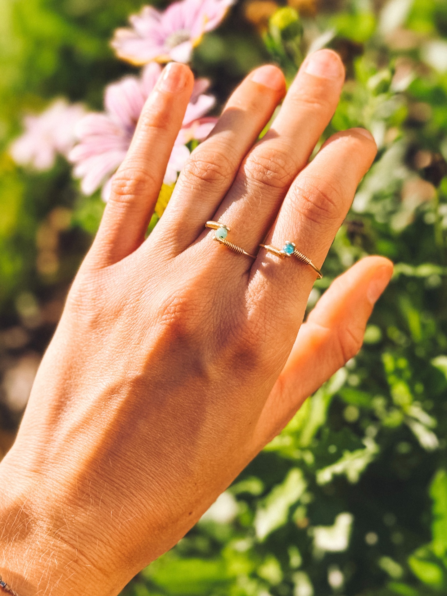 Minimalistický ručně stáčený a drátovaný prstýnek s amazonitem a postříbřením Ag925.
