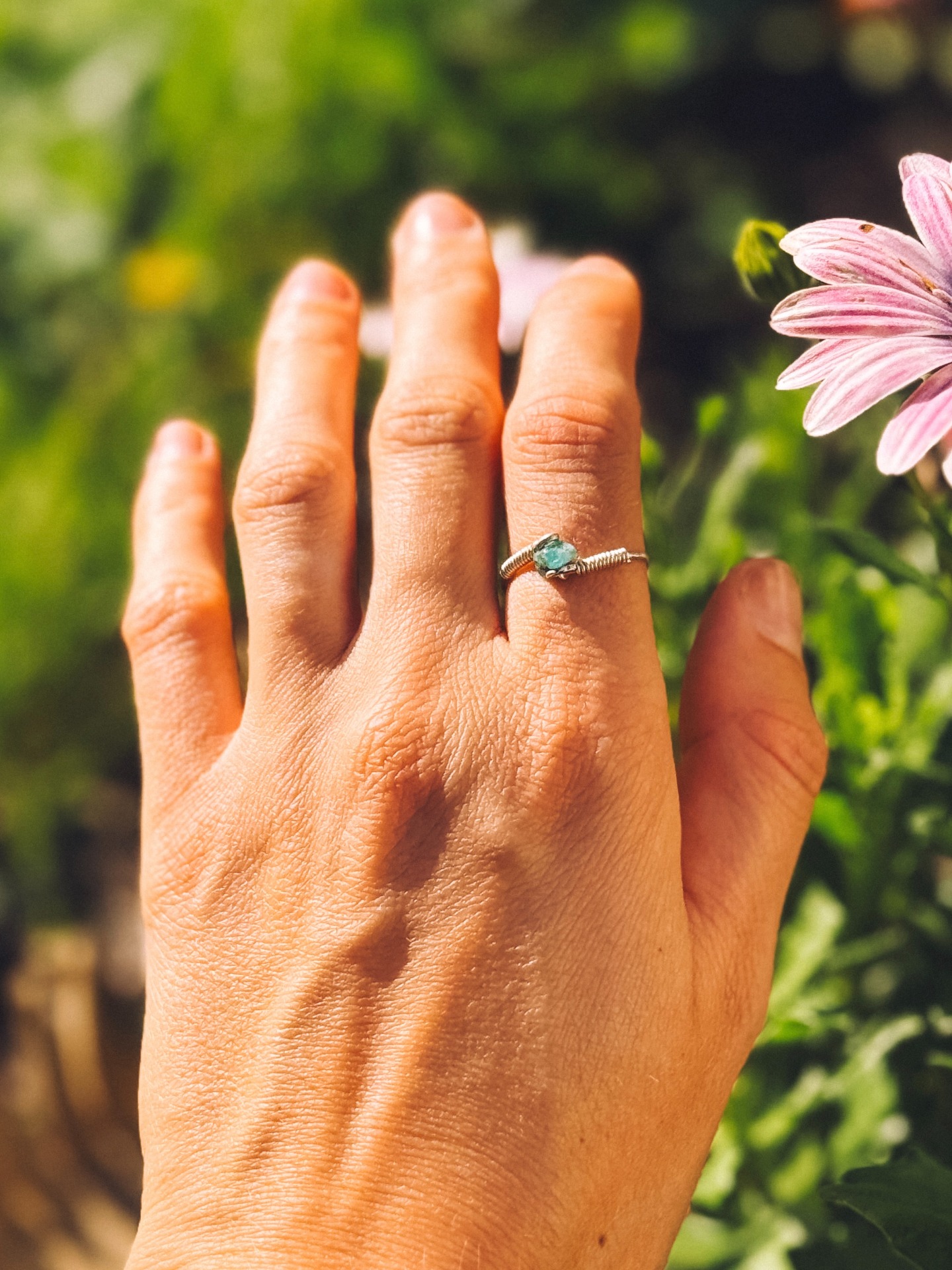 Minimalistický ručně stáčený a drátovaný prstýnek s amazonitem a postříbřením Ag925.