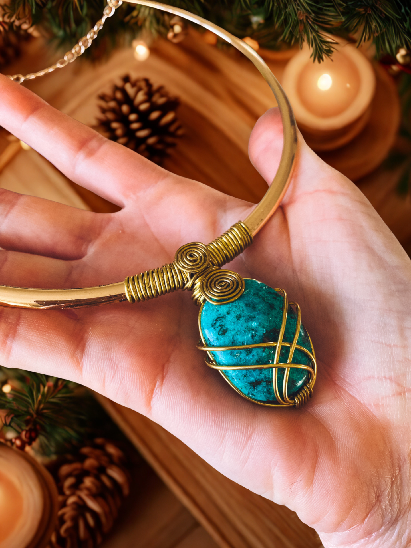 Příběh náhrdelníku: Tento kabošon putoval dalekou cestu přímo z Peru až k nám do Severních Čech, kdy jej jeho dodavatel doslova osobně běžel na poslední chvíli předat dopravci, aby stihl dorazit ještě před Vánoci. A tak je TADY…Kdysi vysoko v andských horách se zrodil tyrkys, který naslouchal Zemi. Učil se tichu kamenů, dechu hor a modlitbám vody, která si razila cestu skálou. Když dozrál, nechal se nalézt ne proto, aby zářil, ale aby chránil. Říká se, že tyrkys z Peru si pamatuje cestu domů. Tomu, kdo ho nosí, šeptá o odvaze jít vlastní stezkou, o pravdě vyřčené srdcem a o klidu, který přichází, když jsme v souladu se sebou i světem. Tento náhrdelník vznikl jako talisman spojení. Mezi nebem a Zemí. Mezi hlasem duše a krokem v každodenním životě.