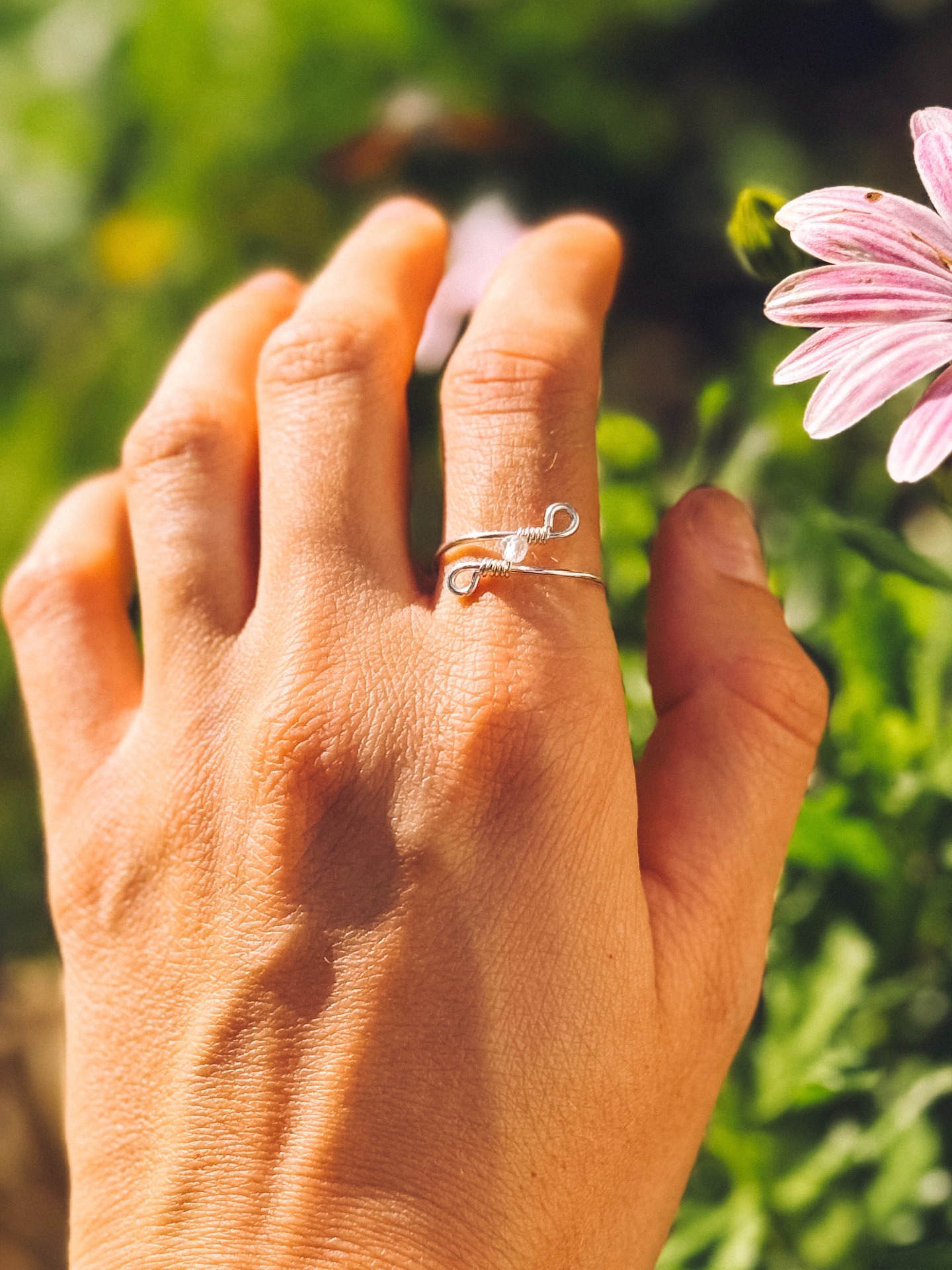 Minimalistický ručně stáčený a drátovaný prstýnek s křišťálem a postříbřením Ag925.