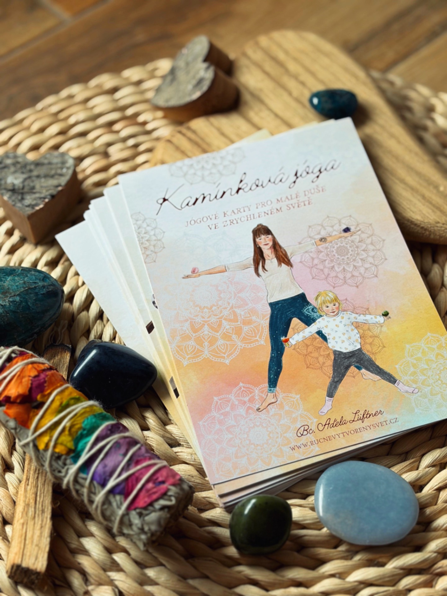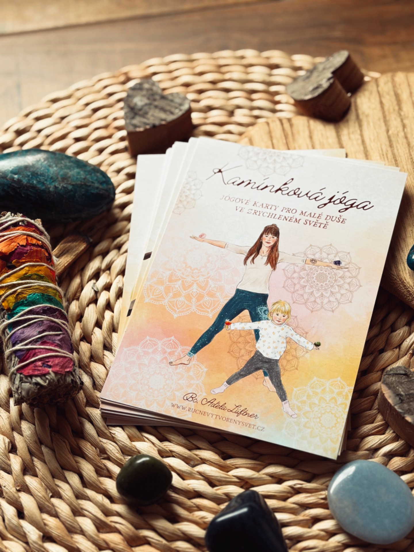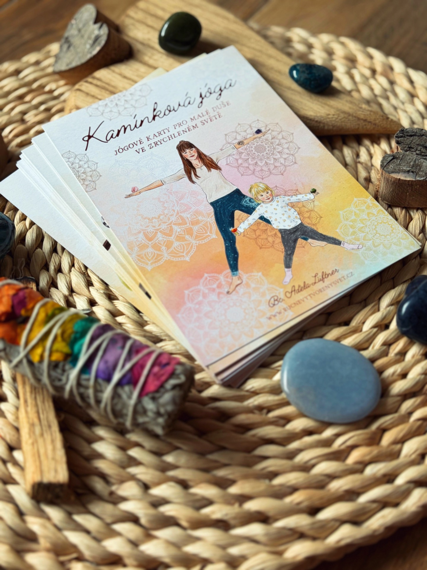 Kamínková jóga vznikala více než rok v tichých večerech, mezi mateřstvím a přemýšlením nad tím, co dnes děti skutečně potřebují. Velkou inspirací mi byla má dcera Josefína Valeria, naše Jovinka. Skrze ni znovu objevuji hravost, přirozený pohyb, opravdovost i schopnost být naplno tady a teď. Mnohé ilustrace v kartách nesou otisk nás dvou a zároveň jsou to kousky našeho společného světa, který si v tichosti hýčkáme. Veškeré texty jsou mou vlastní tvorbou. Každá věta, každé slovo vznikalo s vědomým záměrem. Tyto karty jsem tvořila jako jemný nástroj pro dnešní zrychlenou dobu. Ne jako výkon. Ne jako dokonalost.