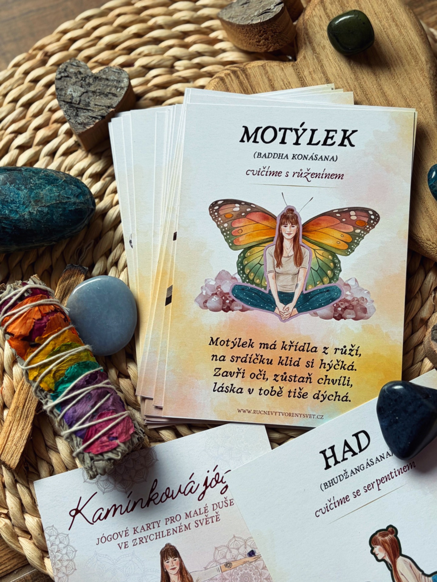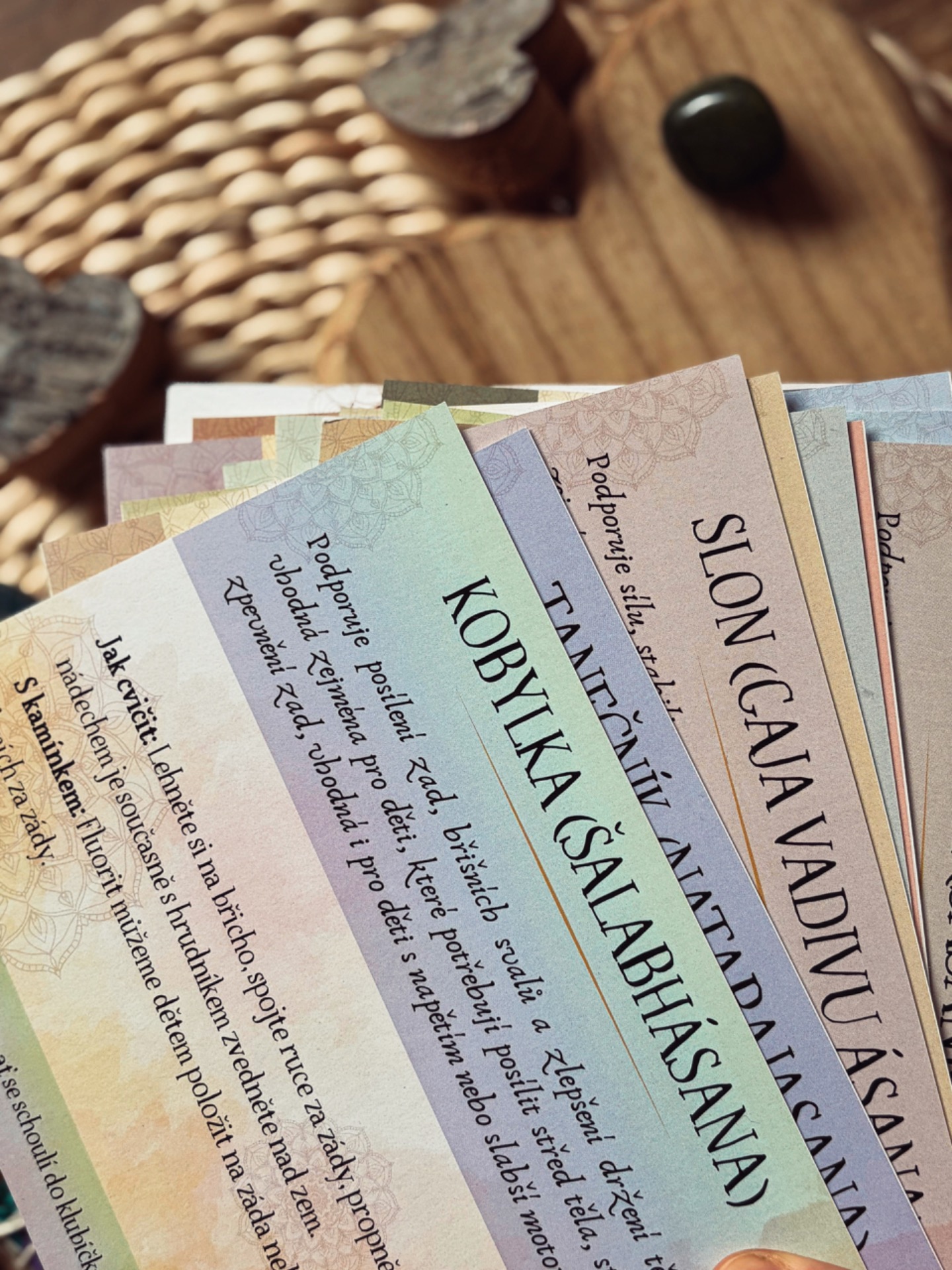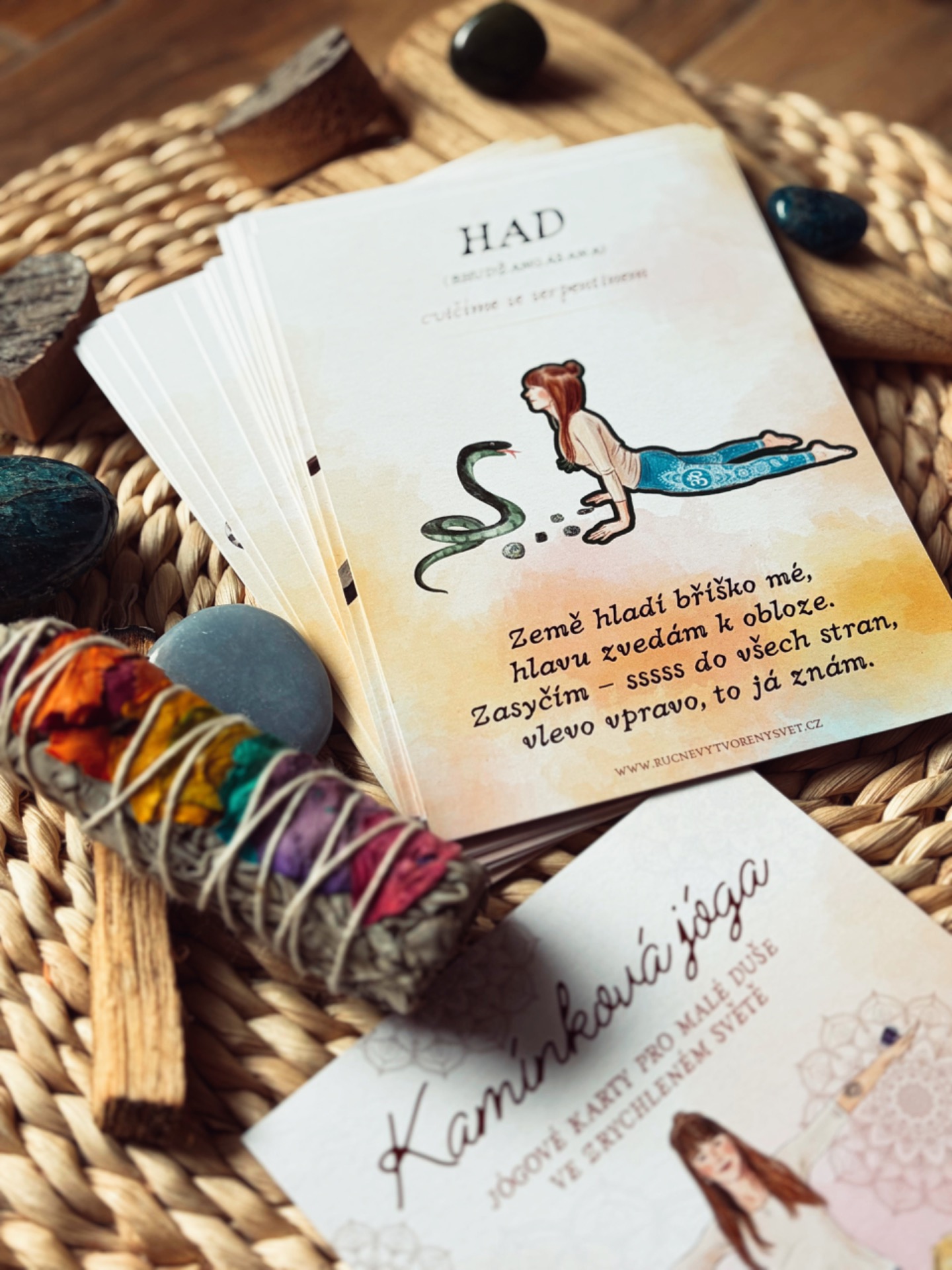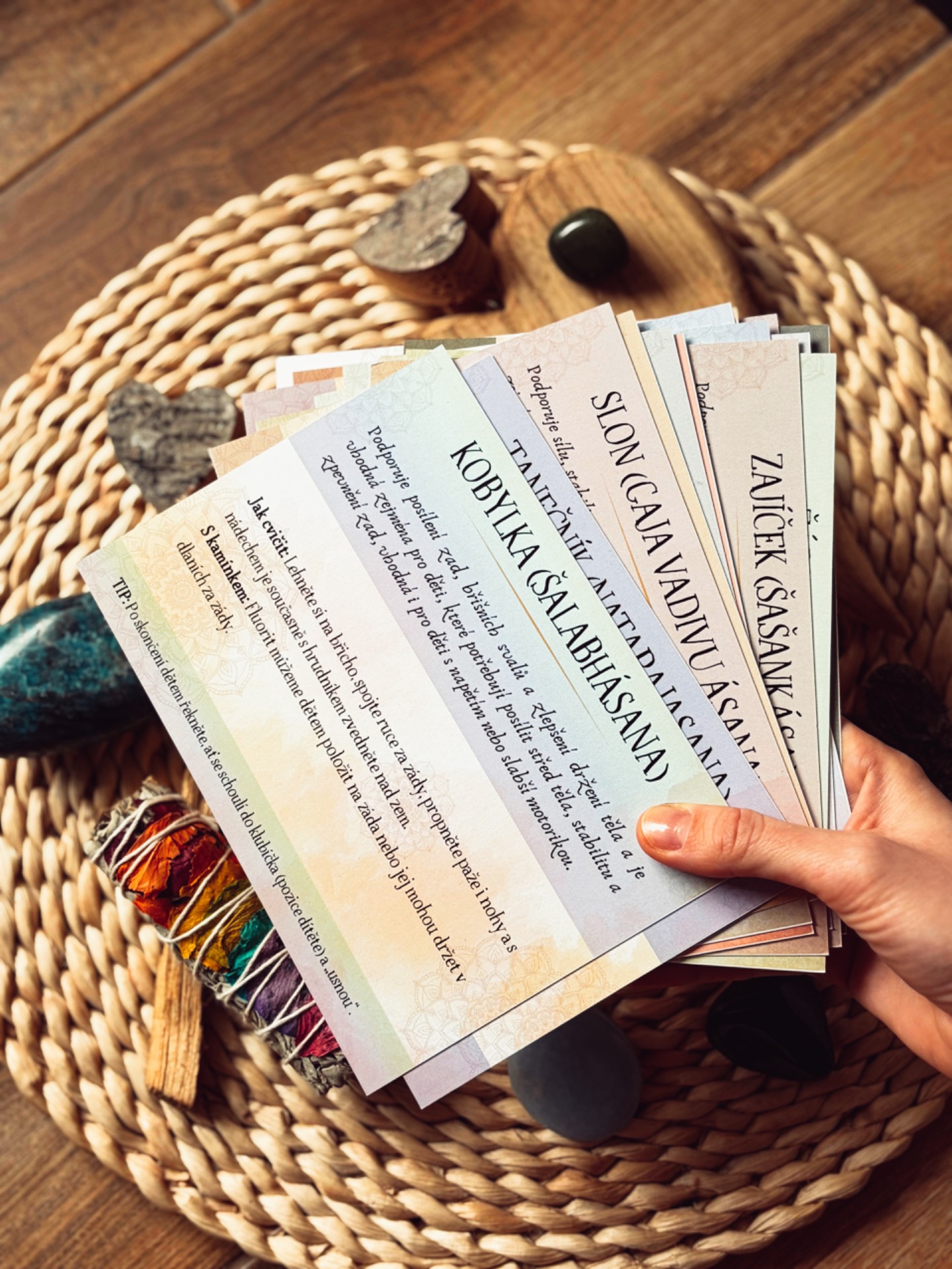 Kamínková jóga vznikala více než rok v tichých večerech, mezi mateřstvím a přemýšlením nad tím, co dnes děti skutečně potřebují. Velkou inspirací mi byla má dcera Josefína Valeria, naše Jovinka. Skrze ni znovu objevuji hravost, přirozený pohyb, opravdovost i schopnost být naplno tady a teď. Mnohé ilustrace v kartách nesou otisk nás dvou a zároveň jsou to kousky našeho společného světa, který si v tichosti hýčkáme. Veškeré texty jsou mou vlastní tvorbou. Každá věta, každé slovo vznikalo s vědomým záměrem. Tyto karty jsem tvořila jako jemný nástroj pro dnešní zrychlenou dobu. Ne jako výkon. Ne jako dokonalost.