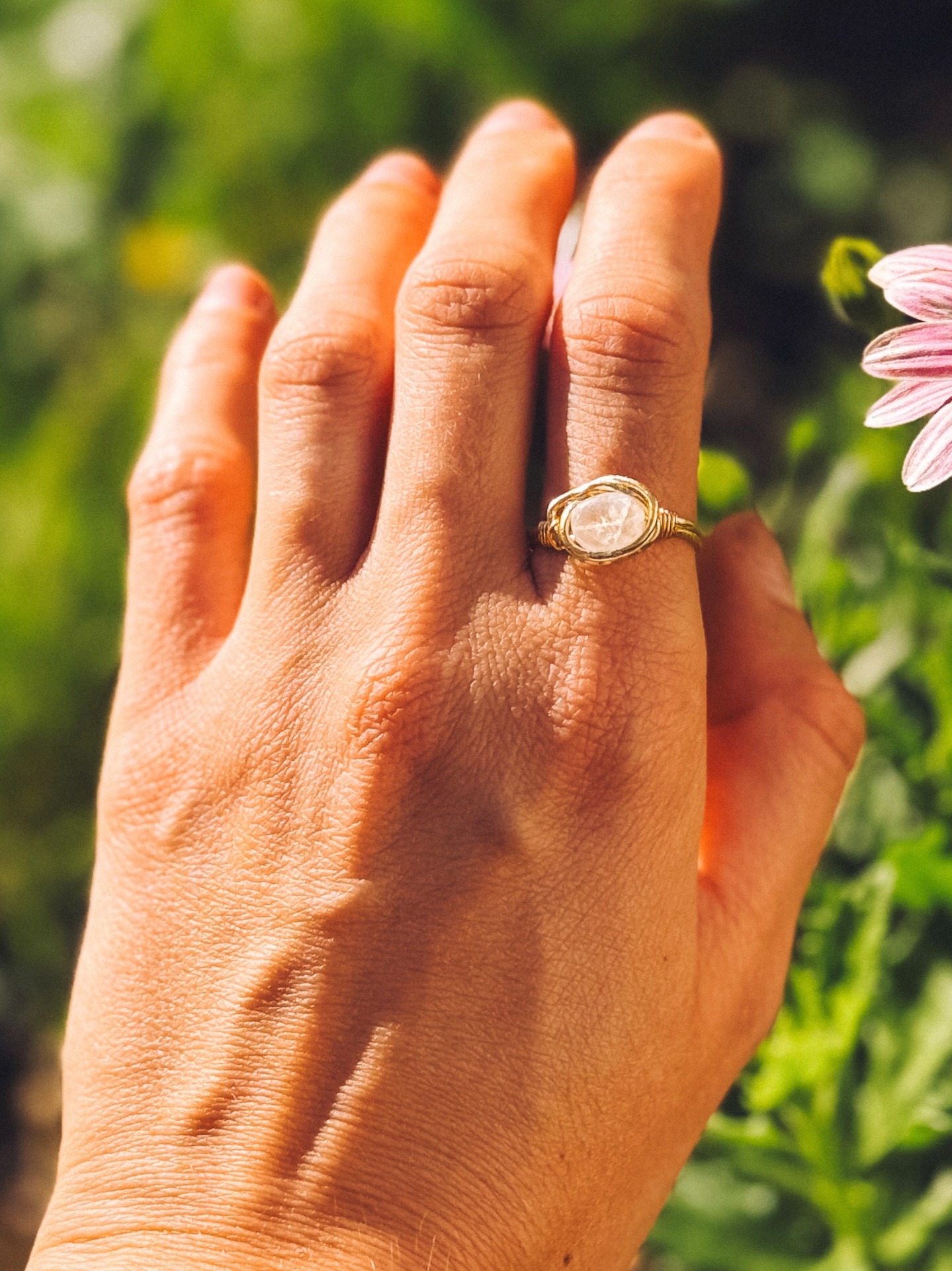 Jedinečný ručně stáčený prstýnek s měsíčním kamenem a pozlacením.