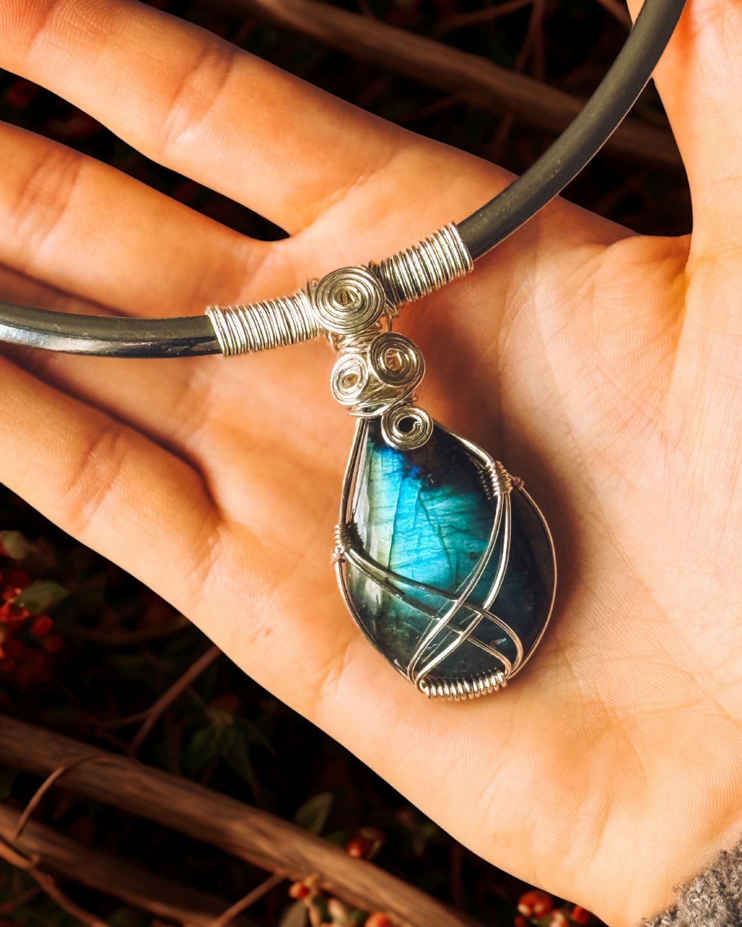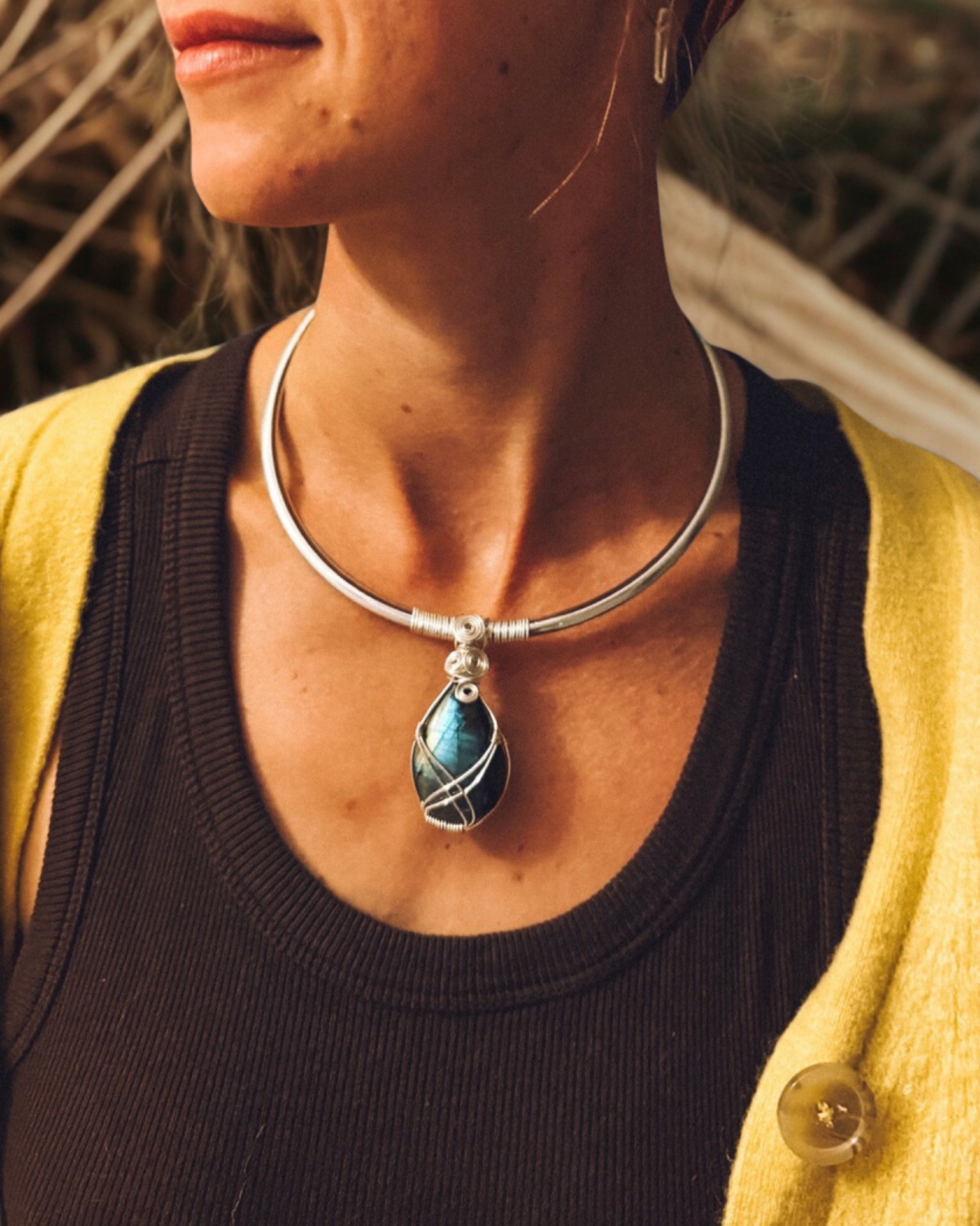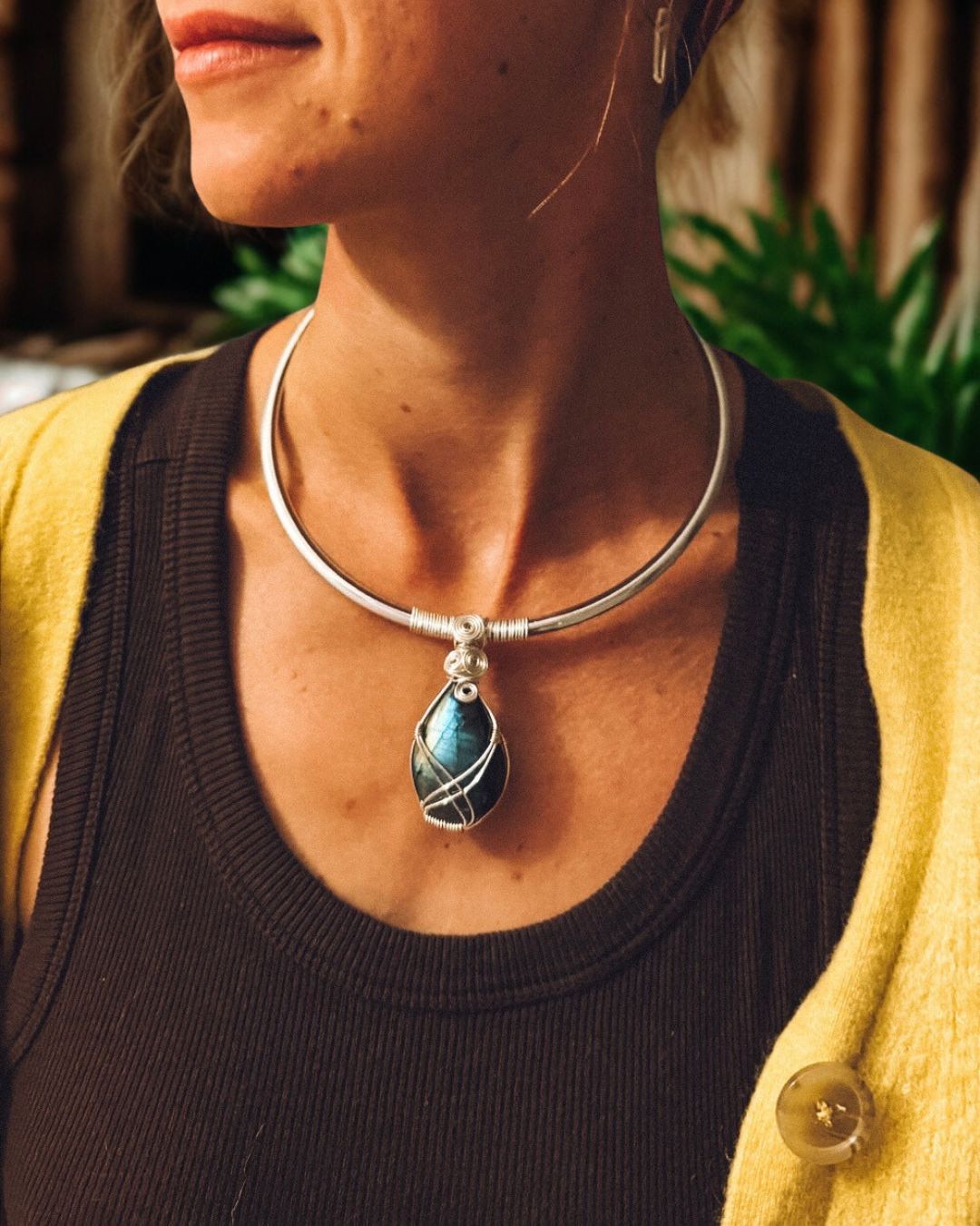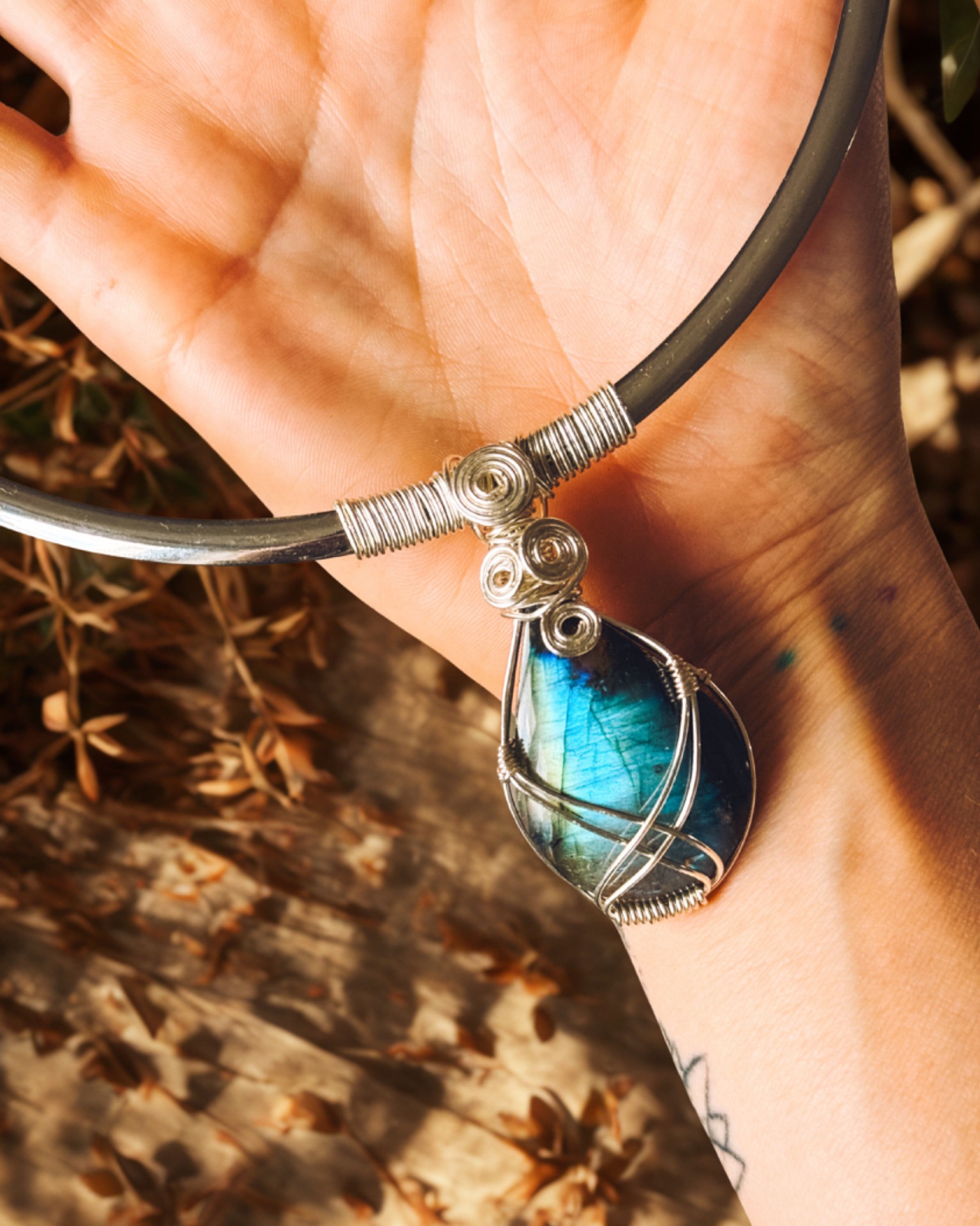 Jedinečný náhrdelník s královským labradoritem pro každou bohyni. Tvořen technikou šperkařského drátování v autorském stylu.