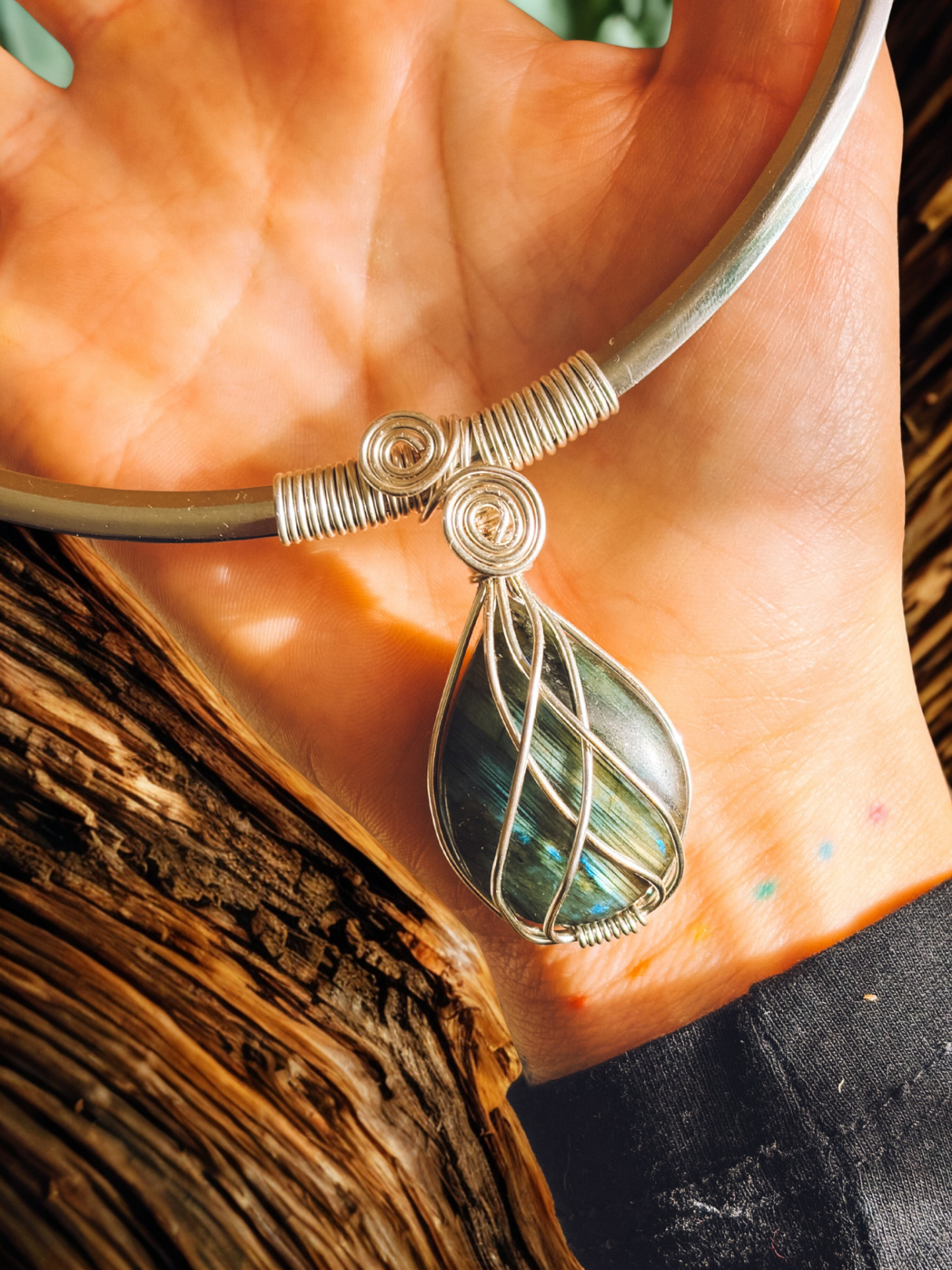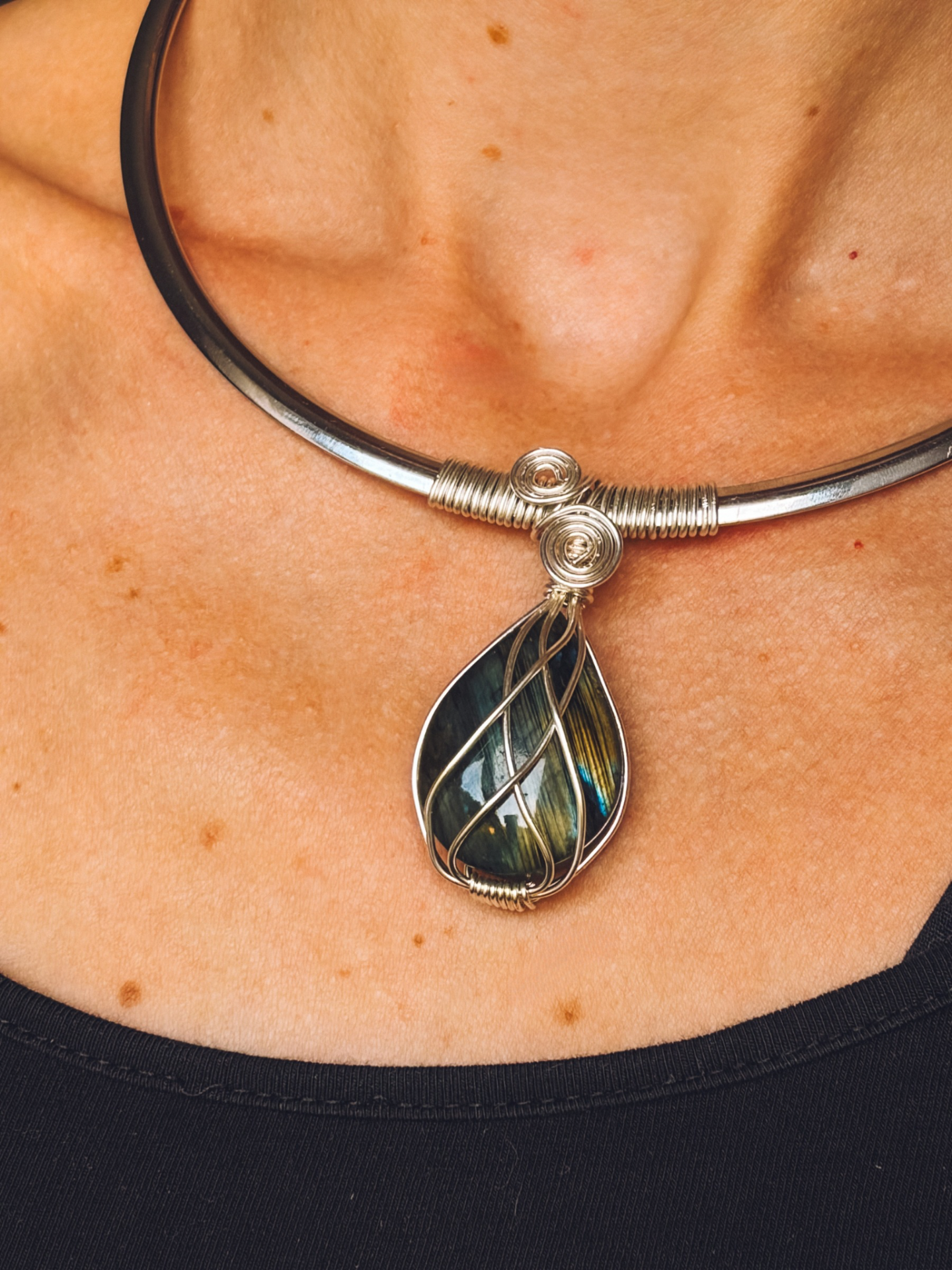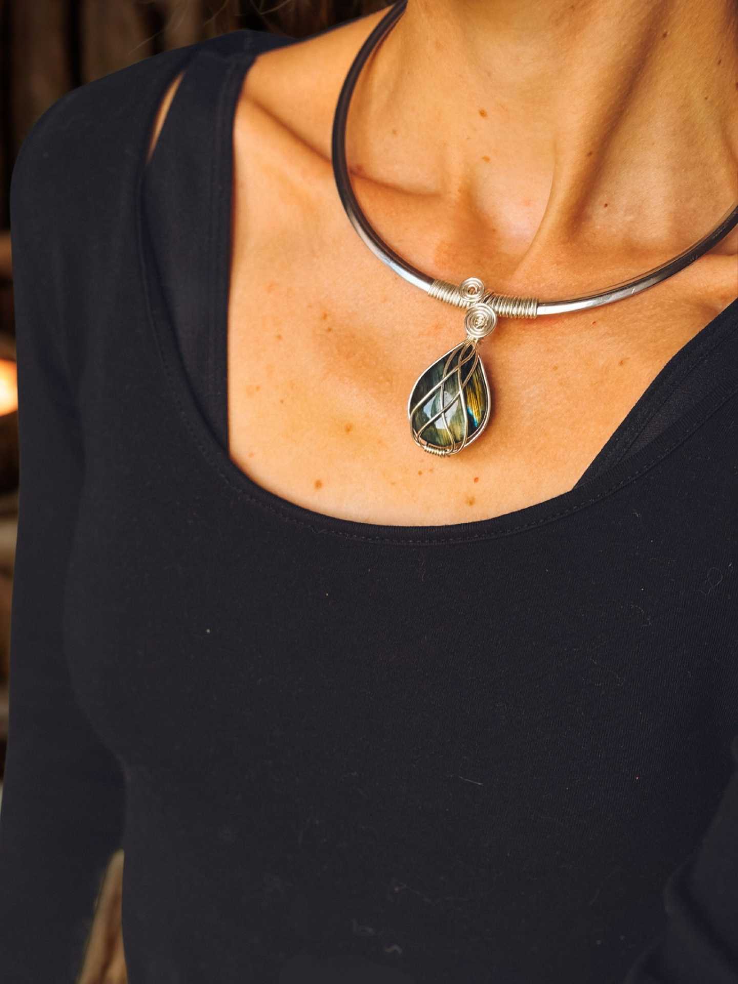 Jedinečný náhrdelník s jedinečným labradoritem pro každou bohyni. Tvořen technikou šperkařského drátování v autorském stylu.