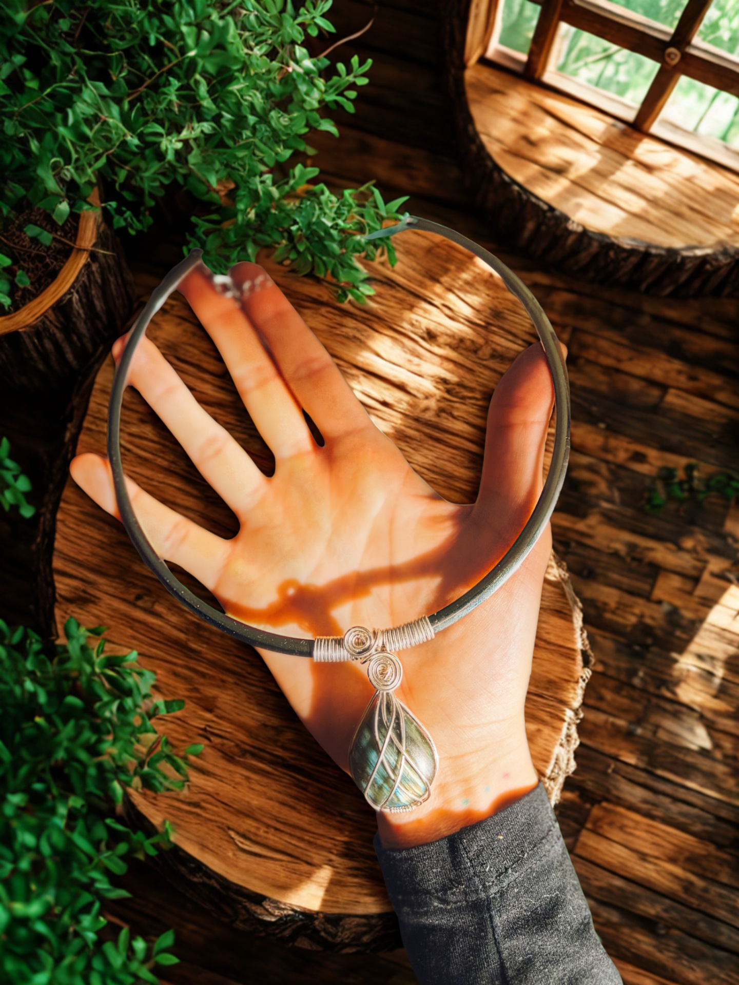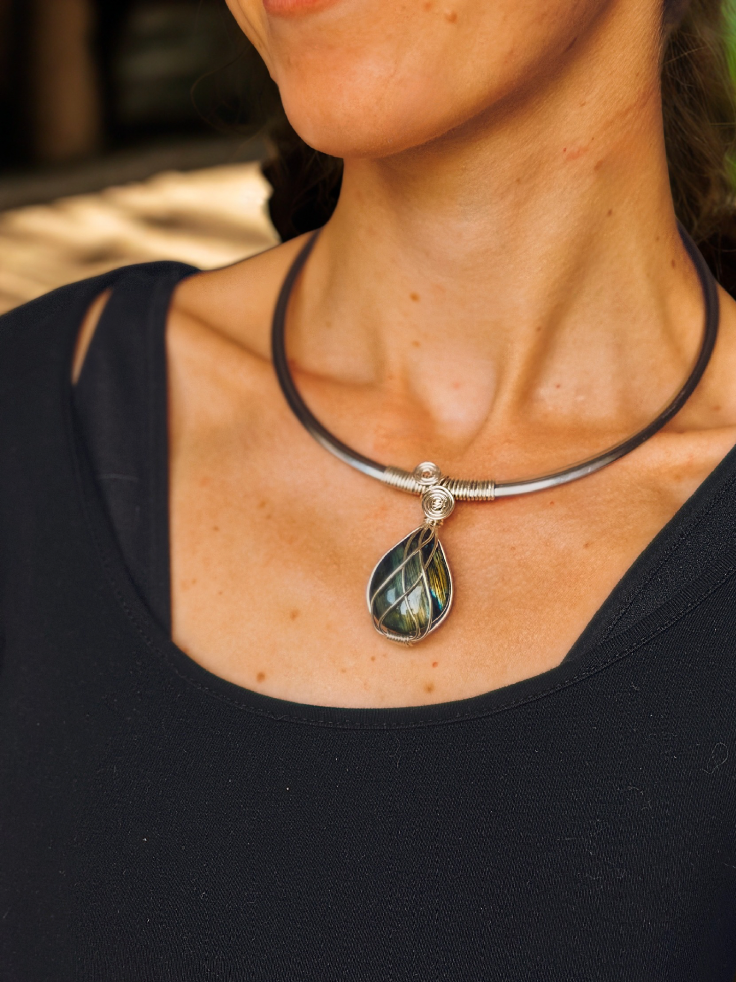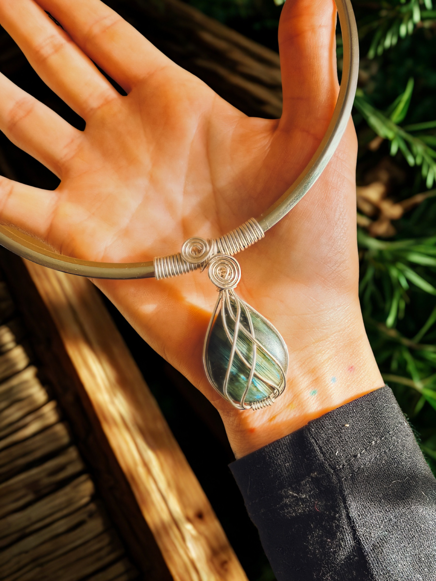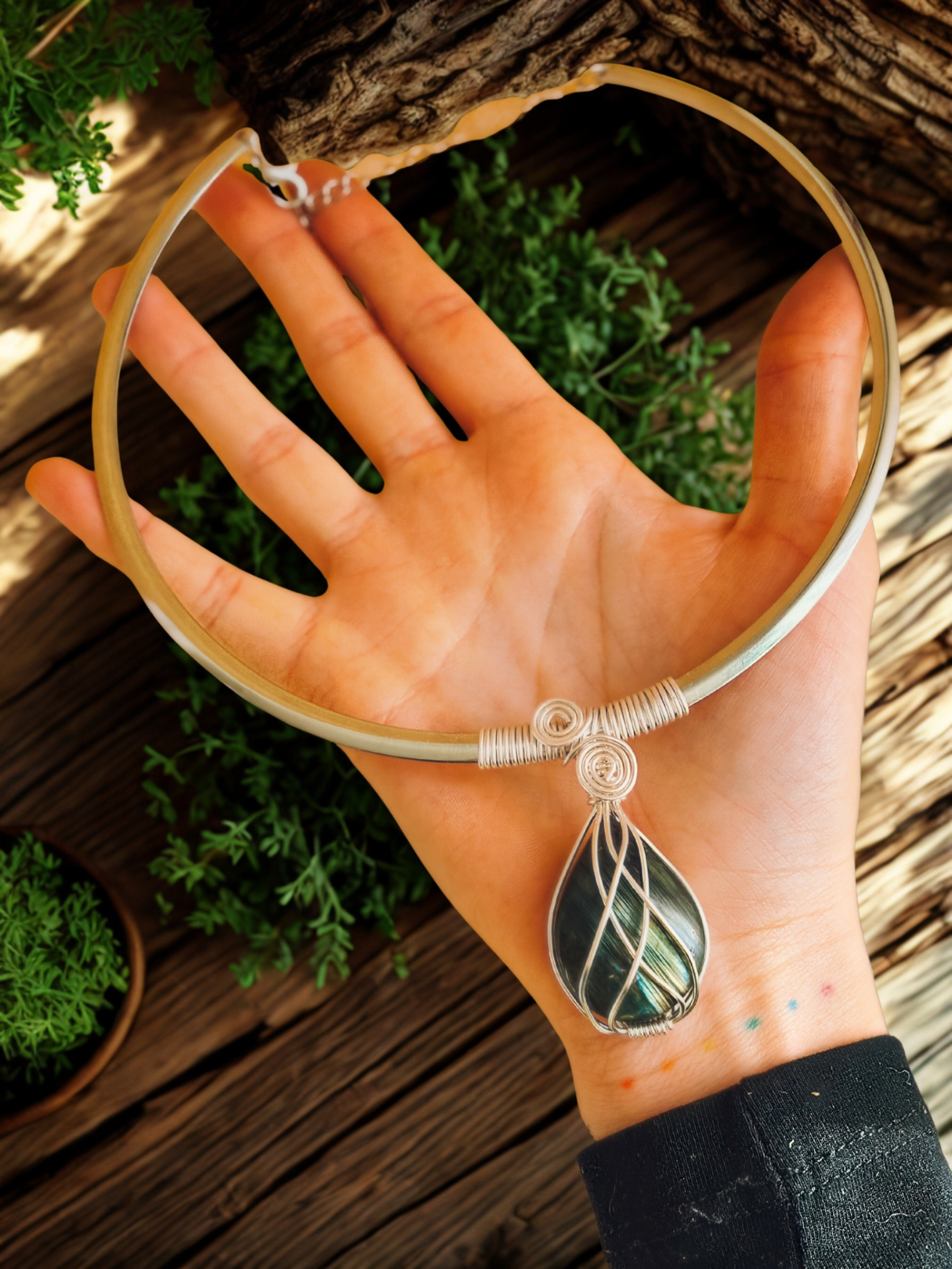 Jedinečný náhrdelník s jedinečným labradoritem pro každou bohyni. Tvořen technikou šperkařského drátování v autorském stylu.